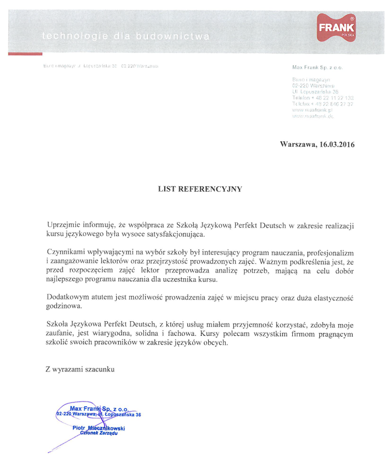 Od około 2 lat korzystamy z usług szkoły języka niemieckiego Perfekt Deutsch. Nasze dzieci (obecnie 7 i 9 lat) mają w warunkach domowych lekcje języka niemieckiego.Zajęcia są dostosowane do wieku dzieci i przebiegają w bardzo miłej atmosferze. Lektorka prowadzi je bardzo ciekawie, korzysta z różnorodnych materiałów i pomocy. Dzieci czekają na kolejne spotkanie z Panią Patrycją. Nauczycielka jest zawsze doskonale przygotowana do zajęć i punktualna. W razie dłuższych nieobecności lektora mamy możliwość skorzystania z zastępstwa. Jesteśmy zadowoleni ze współpracy z "Perfekt Deutsch" i z radością obserwujemy postępy w nauce naszych pociech.